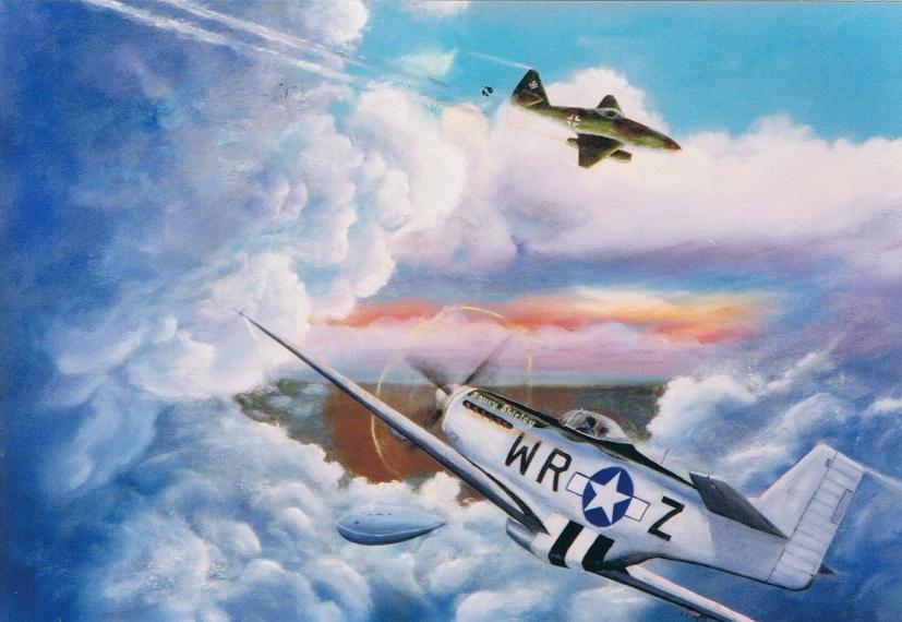 know exactly what to do since I did not have the thinking process of a fighter pilot. The 262 was off my left wing about fifty yards and then slows down. He was not close enough to see the smile on his face but I could see that big black cross on the side of his plane. He just flew along with us and I’m thinking to myself, ‘Now what the hell am I supposed to do?’ Decision time. I told my wingman to get ready to turn into the 262. I said to drop tanks on my command. We had already emptied them; however, we always liked to bring the empty tanks home as they were in short supply. In this case we had to drop them because they ruin the aerodynamics in combat. So I told my wingman to drop your tanks and we turned into the 262 That’s exactly what he was waiting for us to do. He turns into us and puts on power, and he just went right under us, hell-bent for the head of the bombers. He was moving right along - fast!