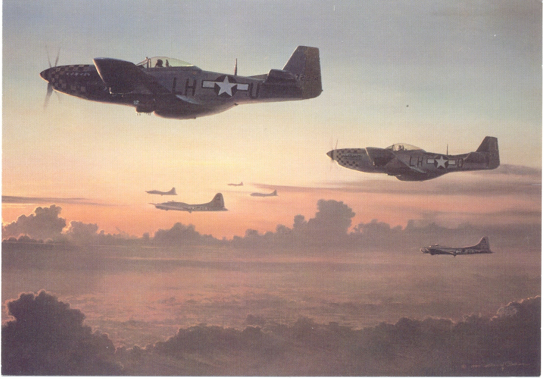 “One time when I was over the middle of Germany with the Scouts - I was deputy leader again, and the commander of our scouting force, Lieutenant Colonel Johnny Brooks was the lead. There were four of us in P-51’s. Johnny and I each had a fighter pilot wingman. My engine started acting up, periodically running rough. I couldn’t see any indication on the instruments as to what might be wrong, but being deep into Germany, I didn’t particularly want to bail out should the unknown problem get worse. I told Colonel Brooks about the trouble and he told me I’d better head to the nearest Allied airfield - not take risks. I called on the frequency of an emergency radio homing station that had been set up in Europe, a frequency that any Allied aircraft could call and receive a steering to the closest airbase. They directed me towards the closest airfield in Allied hands, which was unknown to me at the time. As I fly along over Germany, I see in the distance a B-17 all by itself. I get up closer and note he has three engines feathered! He was losing altitude slowly and doing a beautiful job of keeping as much altitude as he could with only one operating engine. He was the same heading that I had been given.