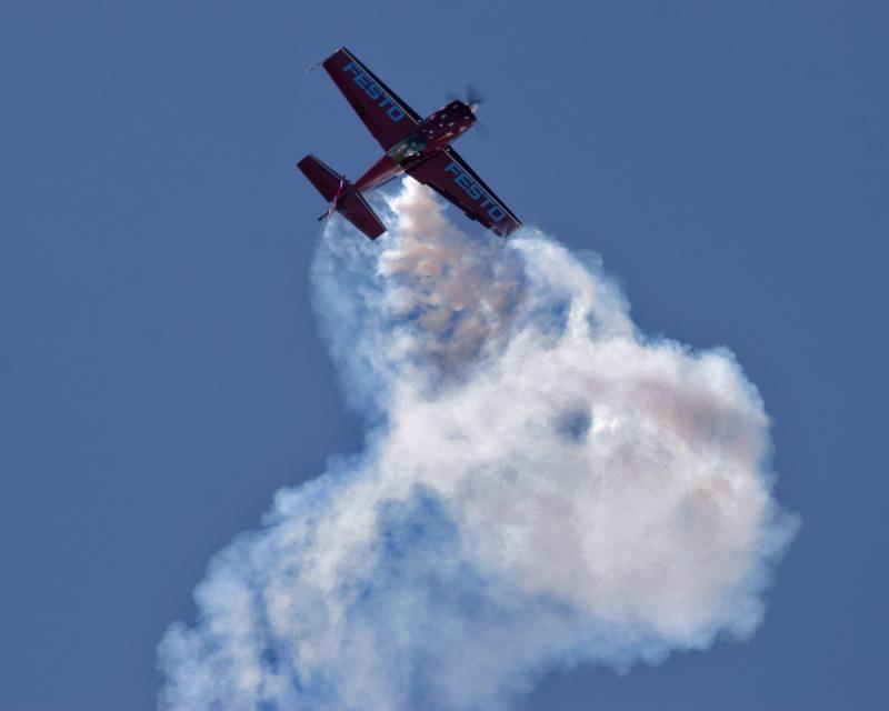 They're very creative people. It's a German-based company and my husband was on their American advisory board because of his degrees in robotics from Stanford, so he does a lot of stuff in that industry, so since he works on the advisory board he got to know the chairman of the company and its a one and a half billion dollar privately owned company that started about 85 years ago so Festo was having a board meeting in Milwaukee during Oshkosh. So my husband went to the board meeting and suggested we go to Oshkosh, but we met their grandson of the founders who owns the company now, and he loves airplanes and Festo built their own airplane and he got to hold the pole for Sean Tucker in his Ribbon cut and I talked to Sean, since I was trying to line up the sponsorship with Festo, so after, the CEO got to hold the pole for him, they said, "Oh sure, we'll sponsor you!" So that's how I got sponsored by Festo.